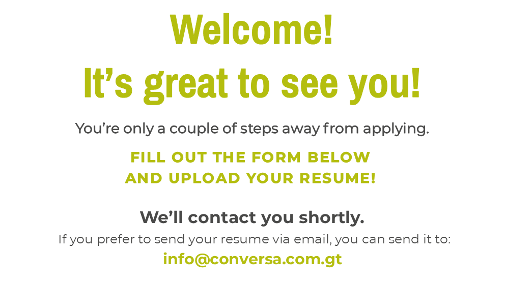 Job Apply Name * Phone * Email * File Upload * Drop a file here or click to upload Choose FileMaximum file size: 7MB Captcha If you are human, leave this field blank. SUBMITMAIL: info@conversa.com.gtTEL: 2269-3989 / 4577-3786Guatemala City, Guatemala